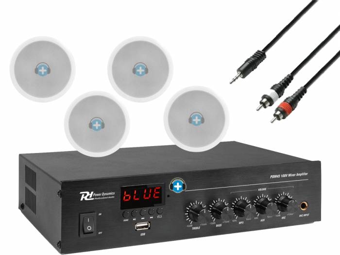 Pack, ideal comercios, tiendas, oficinas.. Salas de espera, hilo musical, megafonia, compuesto por amplificador de potencia con entrada para micro, usb reproductor y conexión bluetooth y 4 altavoces de techo de gran rendimiento