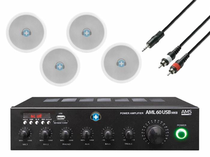 Pack, ideal comercios, tiendas, oficinas.. Salas de espera, hilo musical, megafonia, compuesto por amplificador de potencia con entrada para micro, usb reproductor y conexión bluetooth y 4 altavoces de techo de gran rendimiento