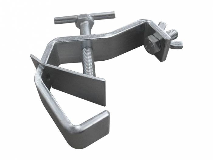 Garra para proyector de iluminación fabricada en acero, para tubo de 50 mm con pletina de protección. Carga máxima: 15 kg. Disponible en color plateado.