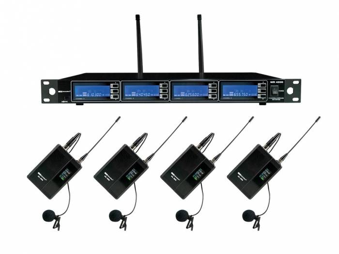 MR 4200 /2 es un sistema de microfonía inalámbrica Diversity de 4 canales en la banda UHF (610 MHz a 640 MHz), con sistema PLL de estabilización de señal. Cuenta con sensor IR para sincronización entre emisor y receptor. La pantalla LCD en el receptor muestra la frecuencia, AF, RF y nivel de ganancia de salida. Con los botones en la parte frontal es posible ajustar la frecuencia manualmente, silenciar el tono y escanear frecuencias libres. El receptor incorpora salida balanceada en cada canal y mezcla desbalanceada para todos los canales. MR 4200/2 se compone de: Receptor (MR 4200) + 4 emisores de petaca y 4 micrófonos de solapa (ML 200).