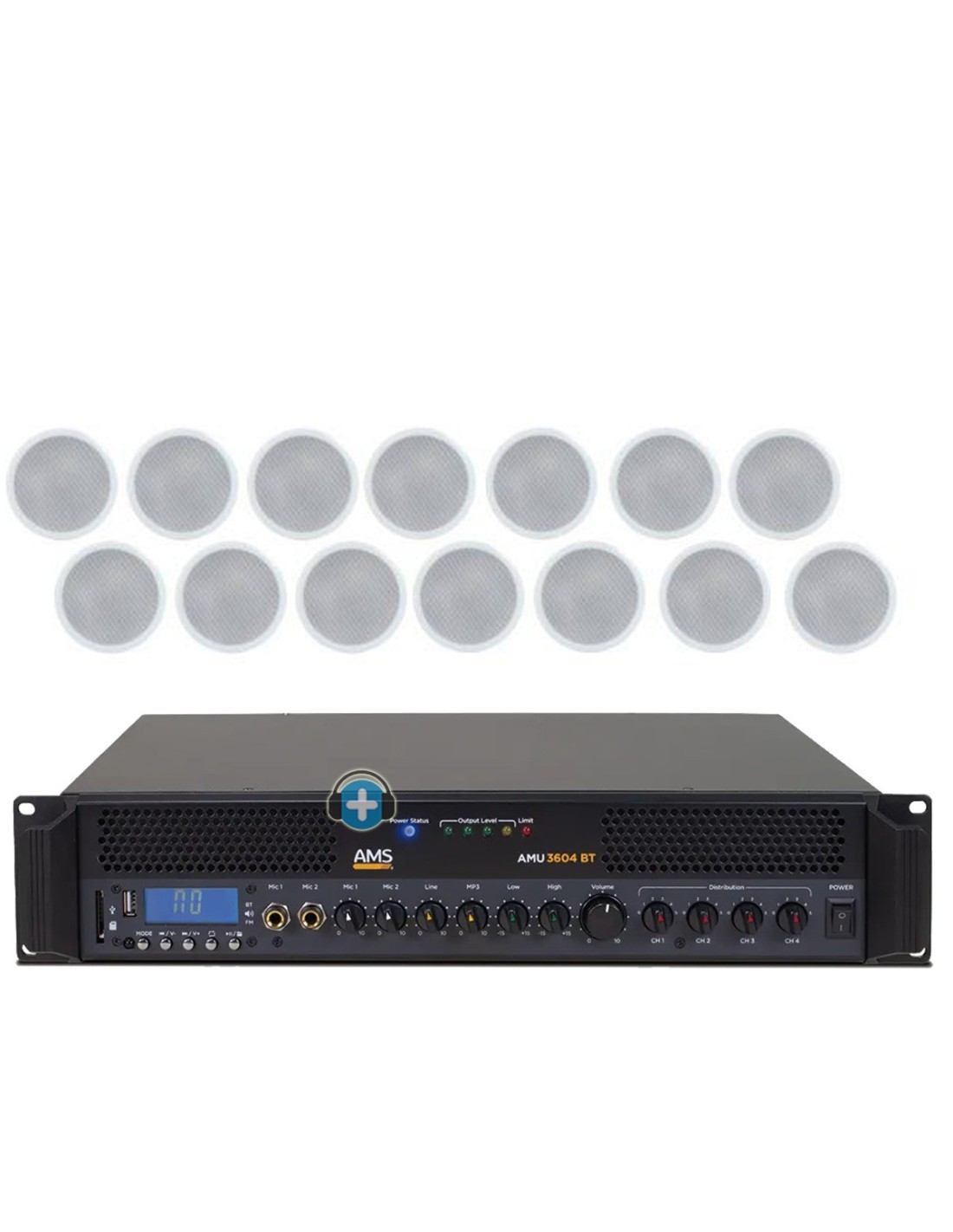 AMU 3604 BT es un mezclador/amplificador que puede operar tanto en baja impedancia (8-16 Ohm) como L100V. Incluye 3 canales de entrada (1AUX + 2 MIC), siendo una de las entradas MIC (MIC 1) con prioridad. Incorpora una interfaz USB para archivos de audio externos, así como conectividad Bluetooth, siendo posible enviar archivos de audio desde un smartphone o dispositivo similar. La pantalla muestra toda la información de pista, modo de funcionamiento, nivel de volumen, número de pista o tiempo transcurrido.